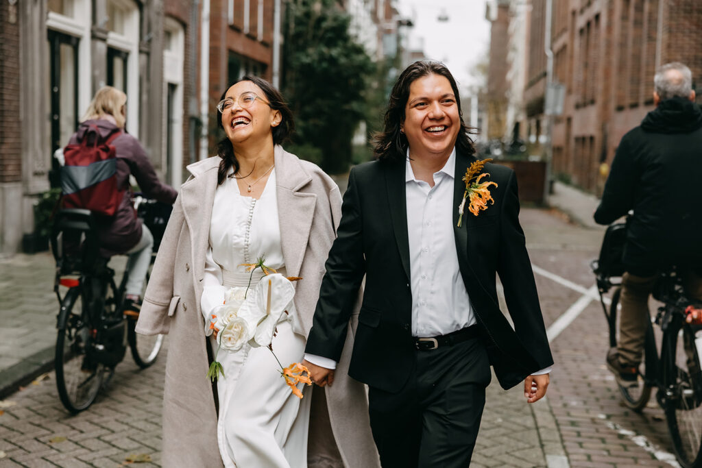 Mexican couple travelling to Amsterdam for an elopement wedding photo shoot holding hands and laughing in the street.