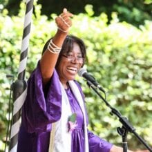Hi Clover, Thank you again for being part of our wedding ceremony. It was absolutely perfect. Here is one of the photos from the boat that shows off your fierce purple robe! Thera & Kevin